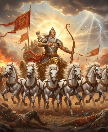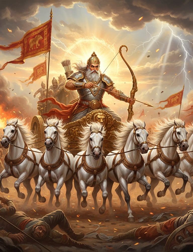 Bhishma conquered not kingdoms, but himself. His control over emotion and desire became his greatest weapon. Even in pain, he remained poised — choosing the divine moment (Uttarayana) to embrace release.