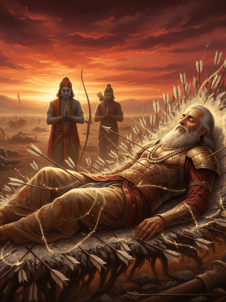 Even as he lay on the bed of arrows, Bhishma’s voice became a fountain of timeless guidance. His teachings on dharma, leadership, and virtue shaped Yudhishthira — and through him, the future of Hastinapur.
