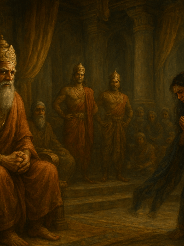 Yet the very vow that crowned him with honor became the chain that bound his silence. He beheld adharma grow within the royal house, saw injustice clothed in power, and witnessed kin turn against kin. His heart knew the truth, but his tongue remained still, for his oath stood above all worldly judgment. Thus did Bhishma suffer the torment of righteousness restrained by obedience.