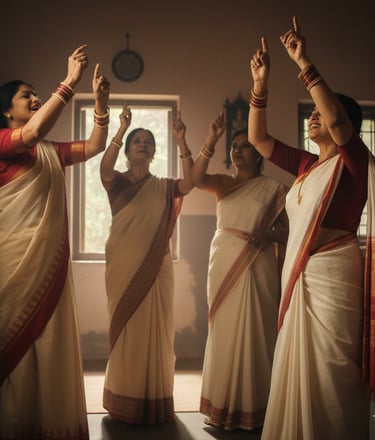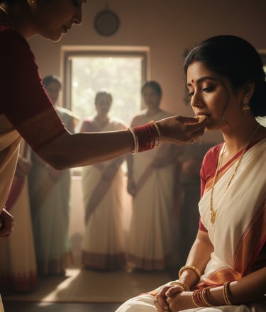 As the sky hesitates between night and dawn, the bride and groom are surrounded by married women of the family. Mothers, aunts, and elder sisters in law gather quietly, women who have already walked the path the couple is about to begin.
