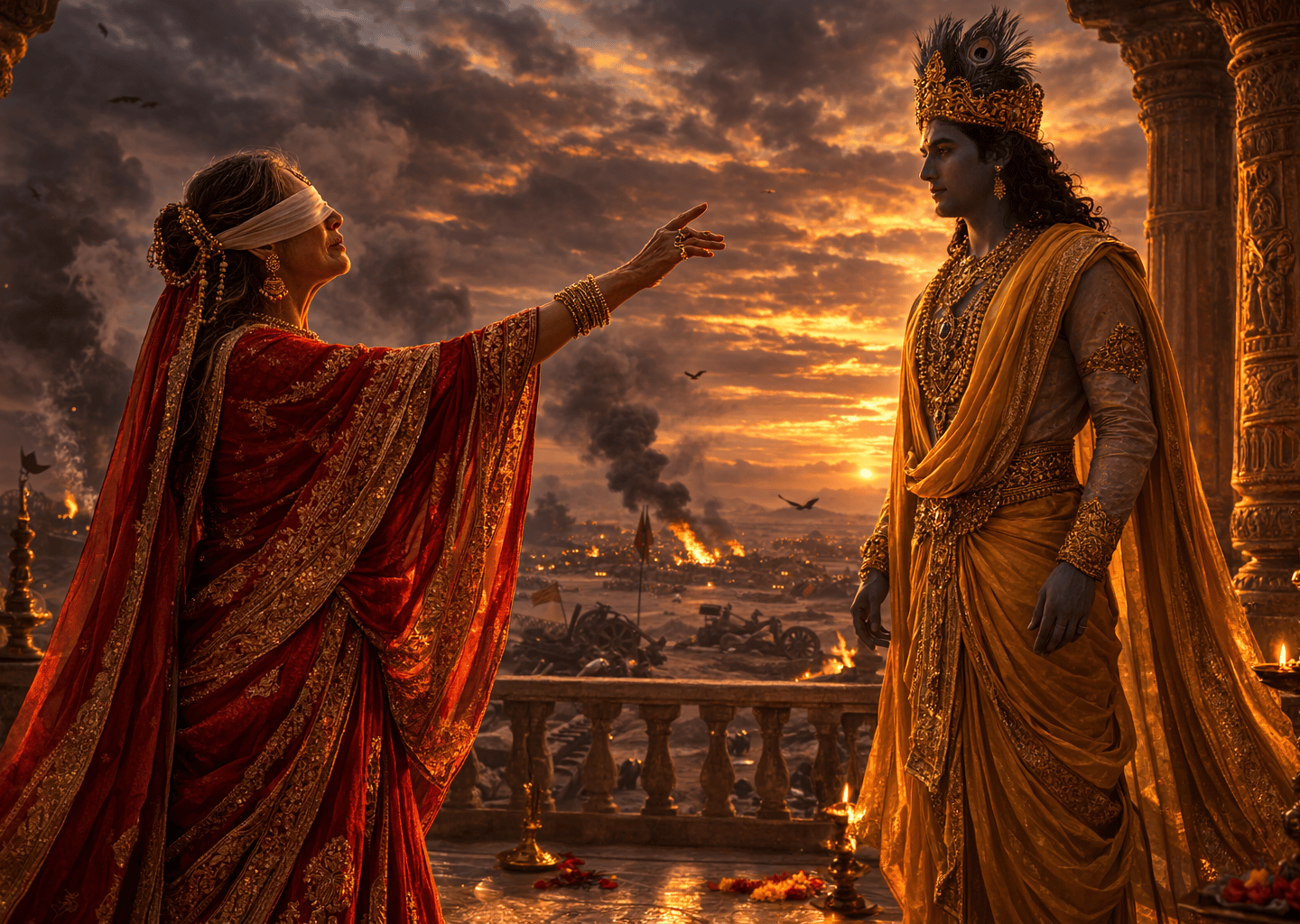 When the war ended and Gandhari stood amid the bodies of her hundred sons, something in her finally broke — not her dignity, but her restraint.
