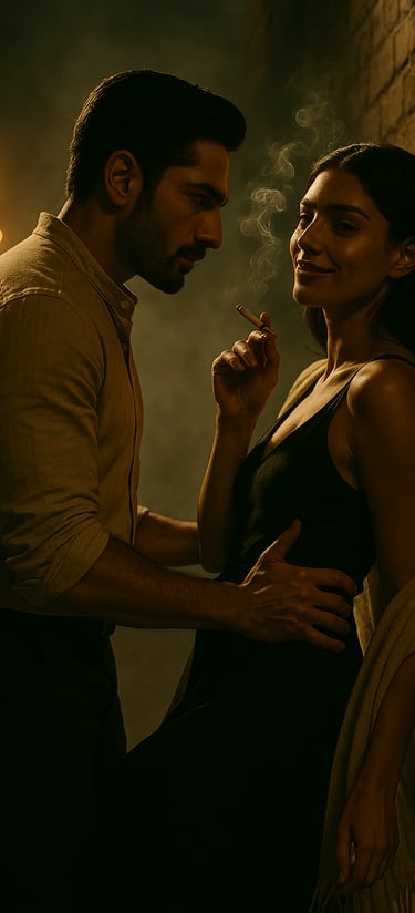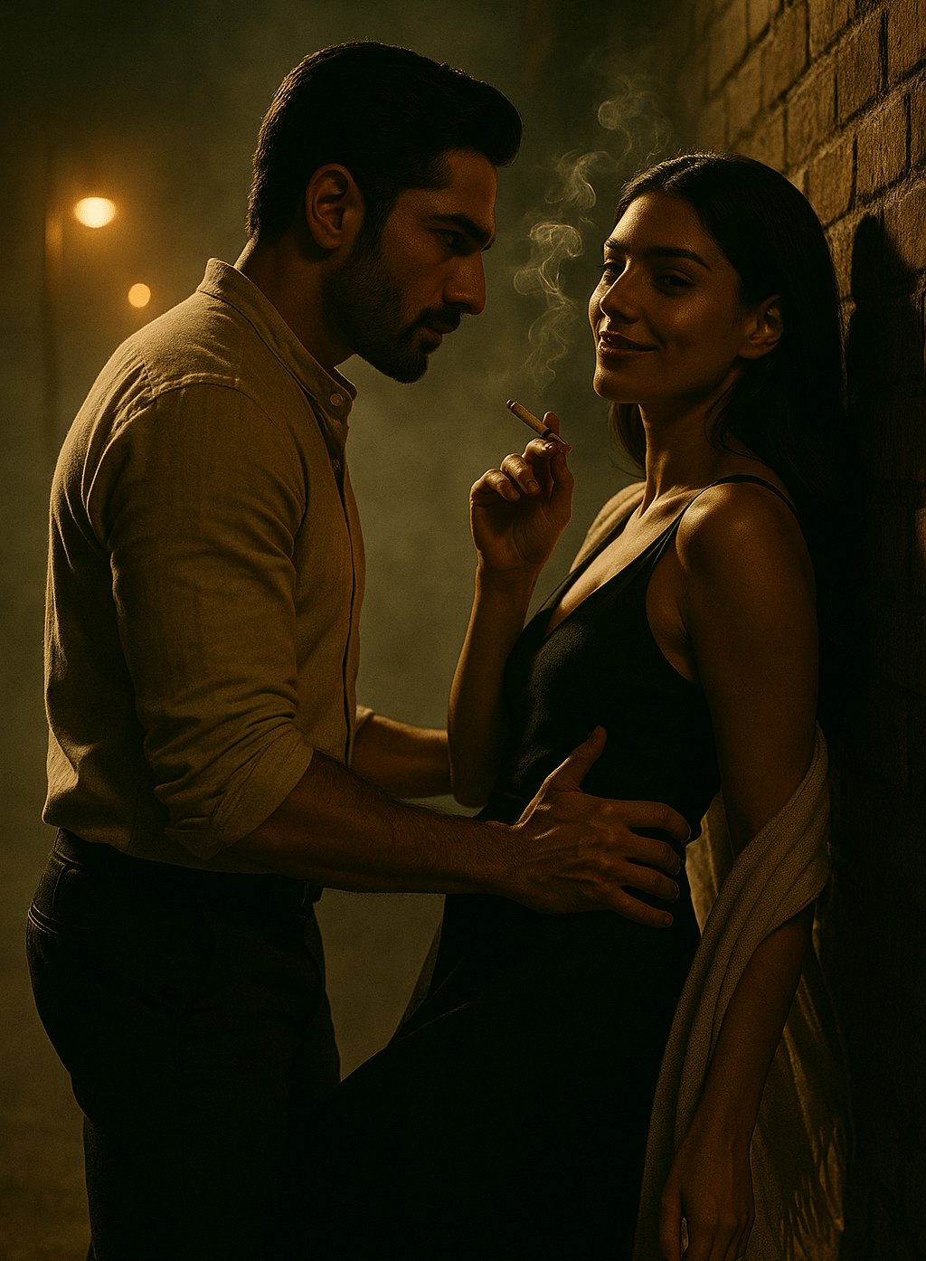 Priya lifted her cigarette again, the ember glowing like a predator’s eye, and took a slow drag. She exhaled toward him, the smoke curling into the space between their bodies like a whispered dare.