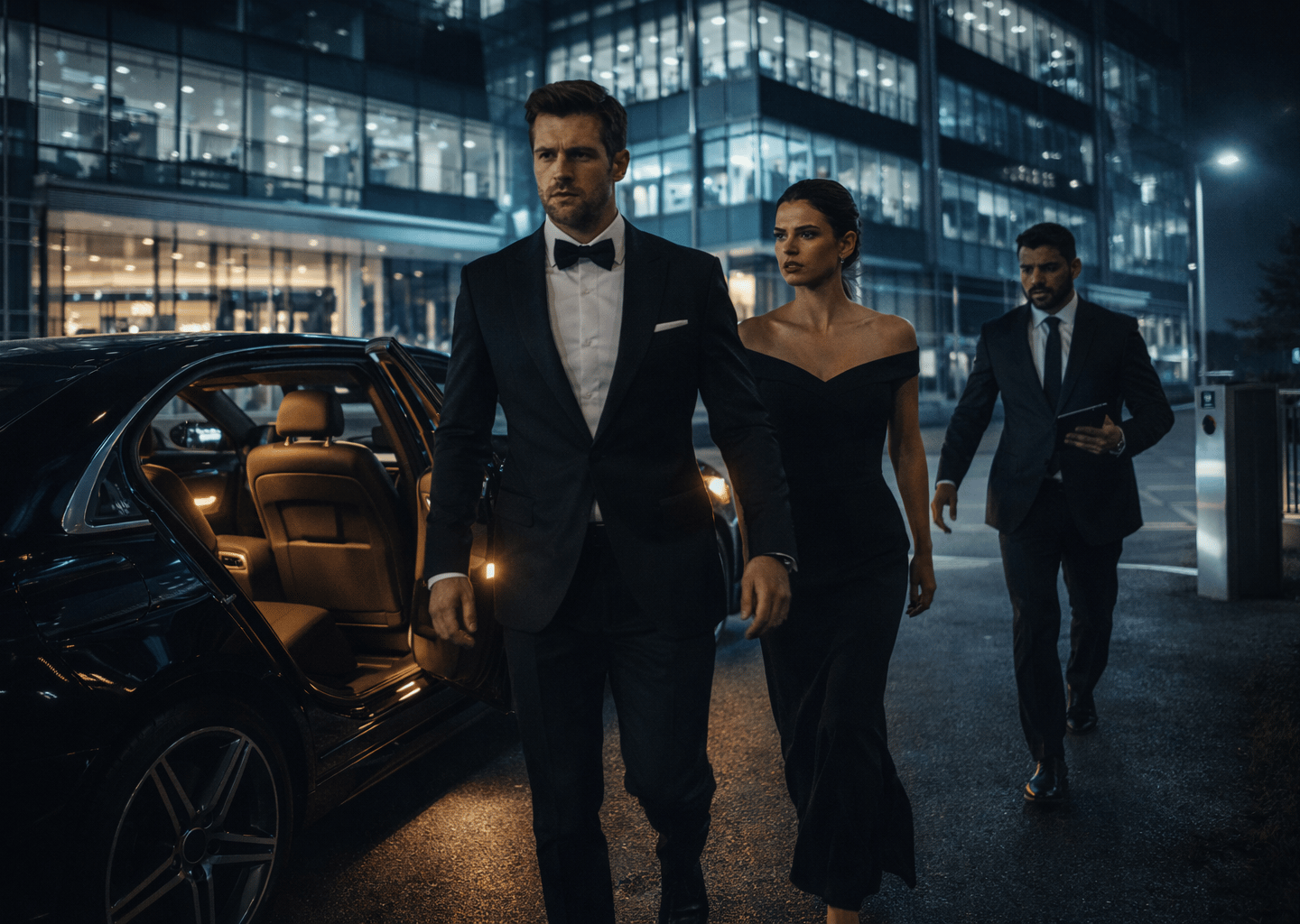 Setting: The Chairman and Zara emerge from the private quarters. He's in a fresh suit—charcoal gray, perfectly tailored, every inch the emperor. She's in tactical gear—efficient, dangerous, ready for war. They could be two completely different people from the ones who entered that bedroom.