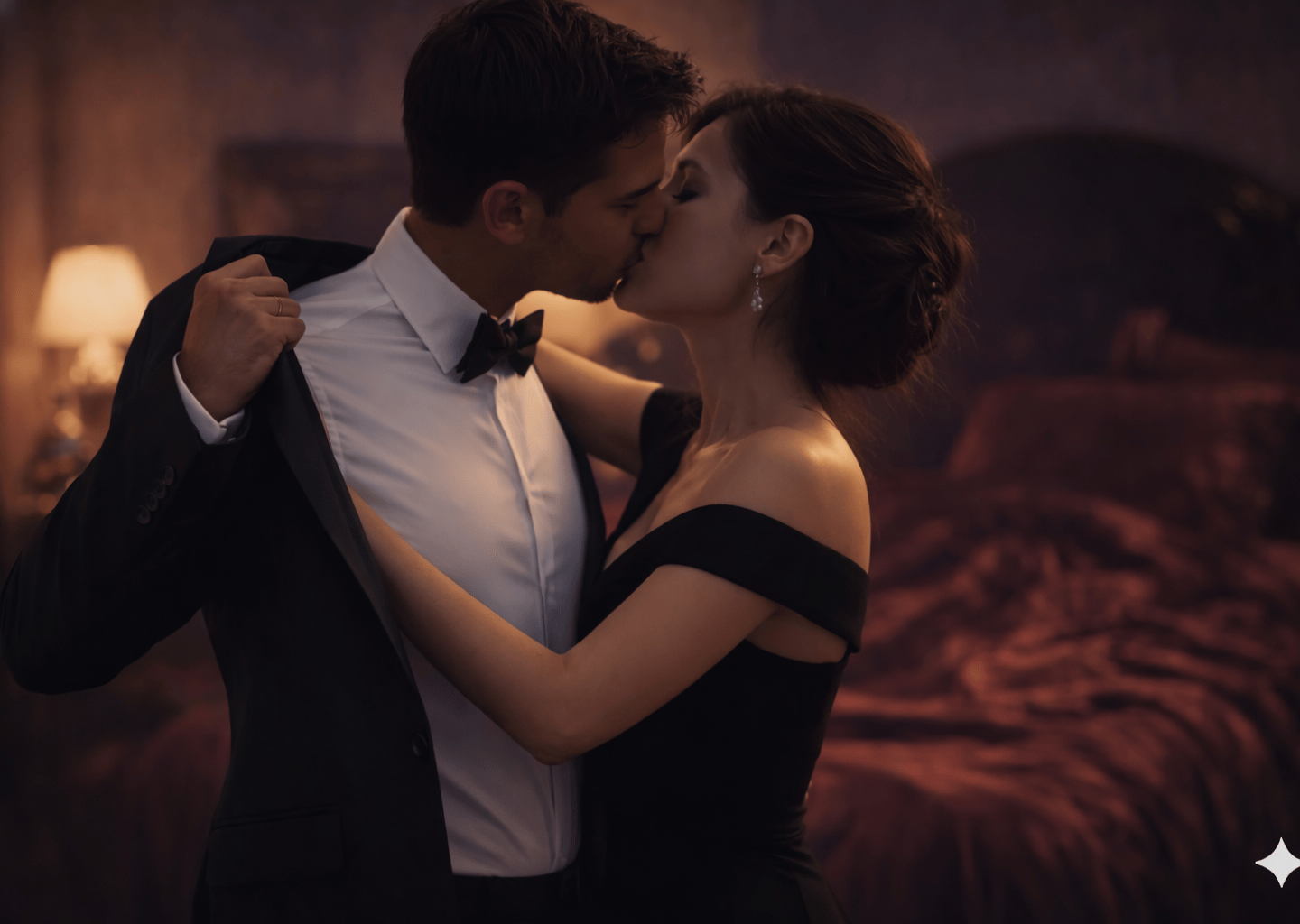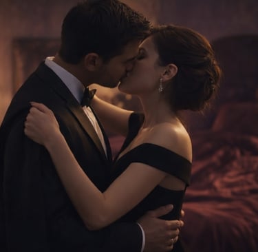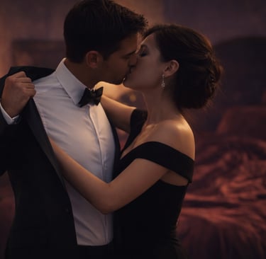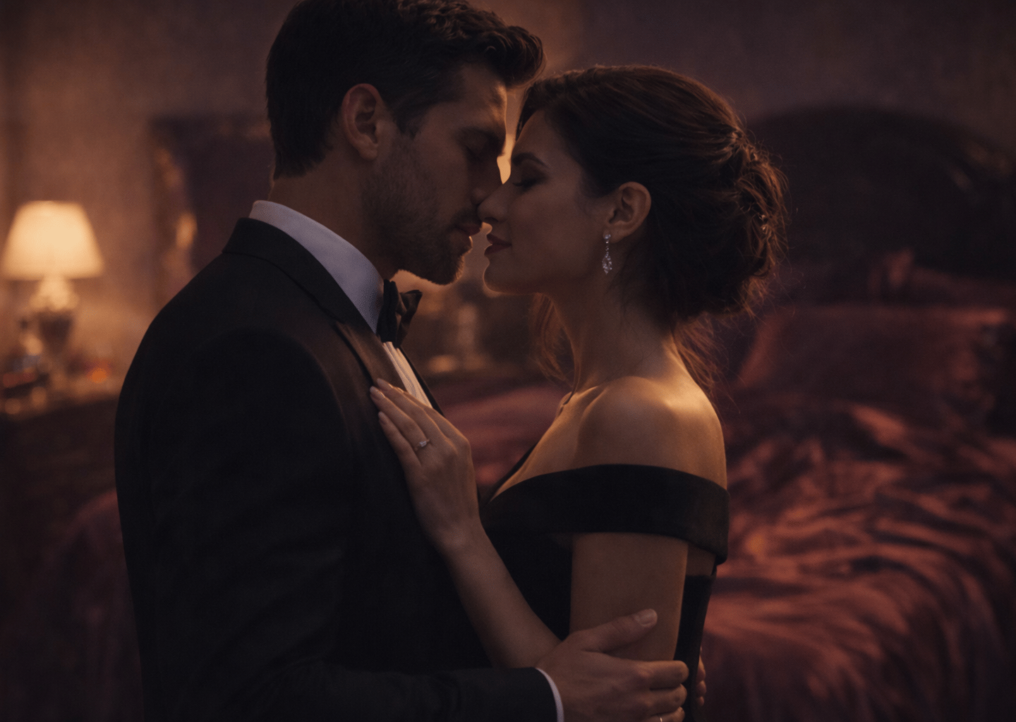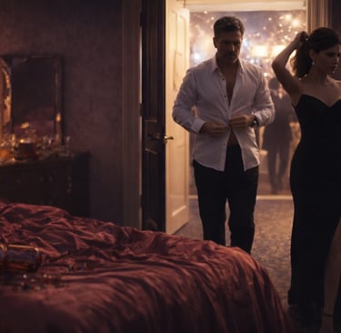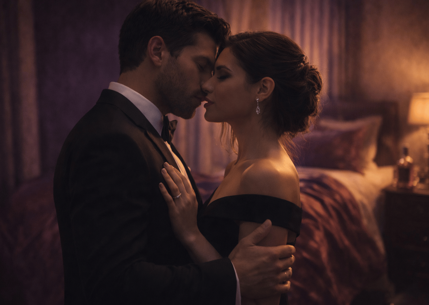 The room is a haze of bruised purple light and the heavy scent of spilled rye. Their clothes are scattered across the floor—her black gown draped over a chair, his shirt abandoned near the door.