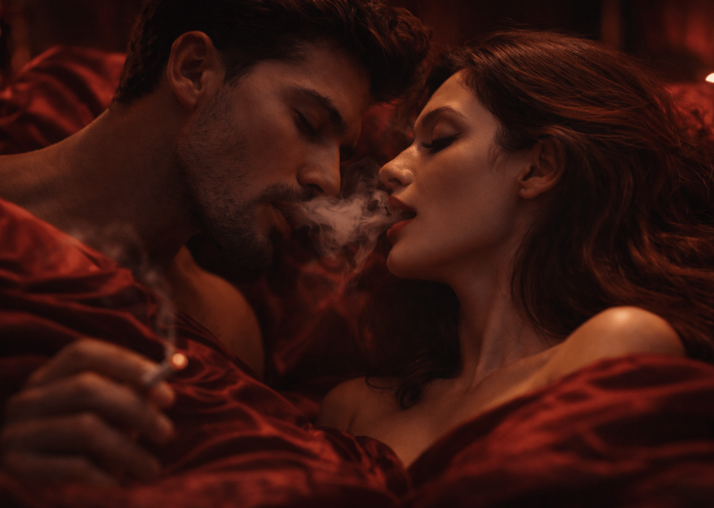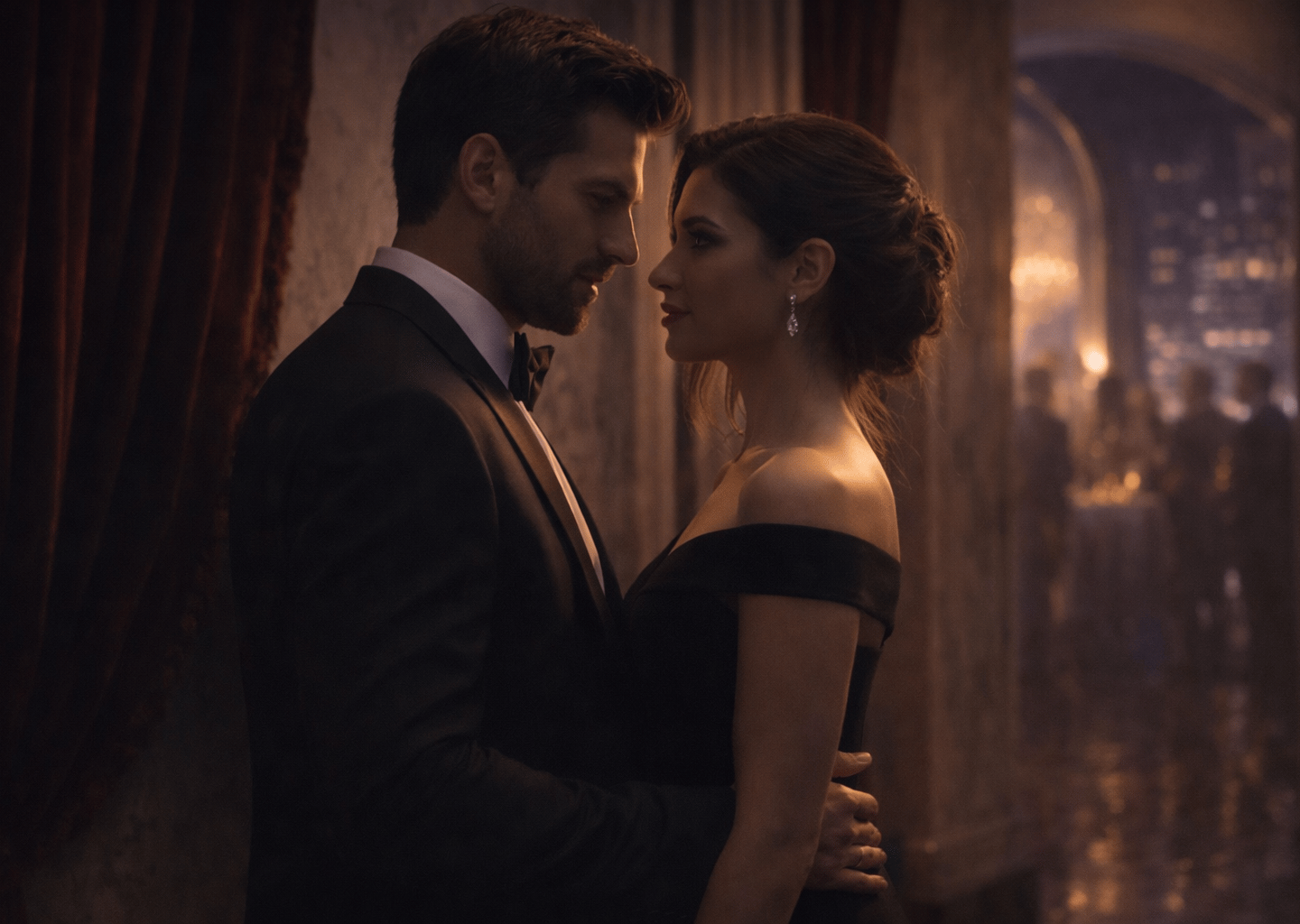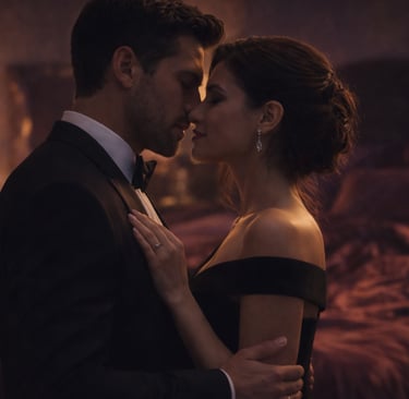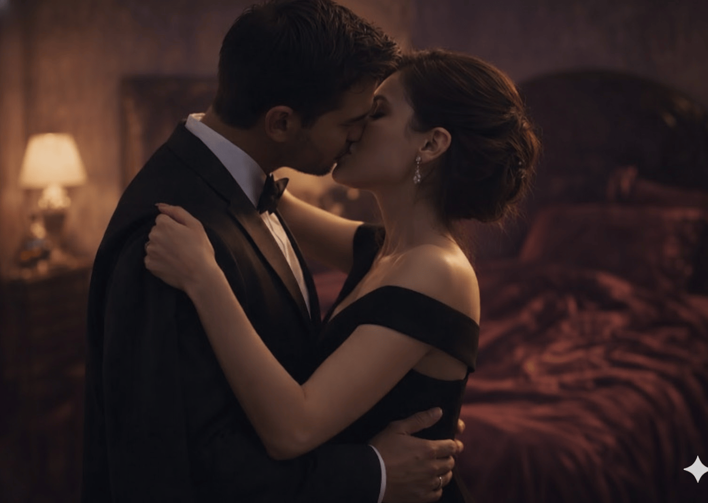 The room is a haze of bruised purple light and the heavy scent of spilled rye. Their clothes are scattered across the floor—her black gown draped over a chair, his shirt abandoned near the door.