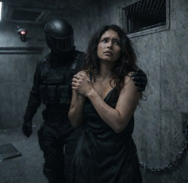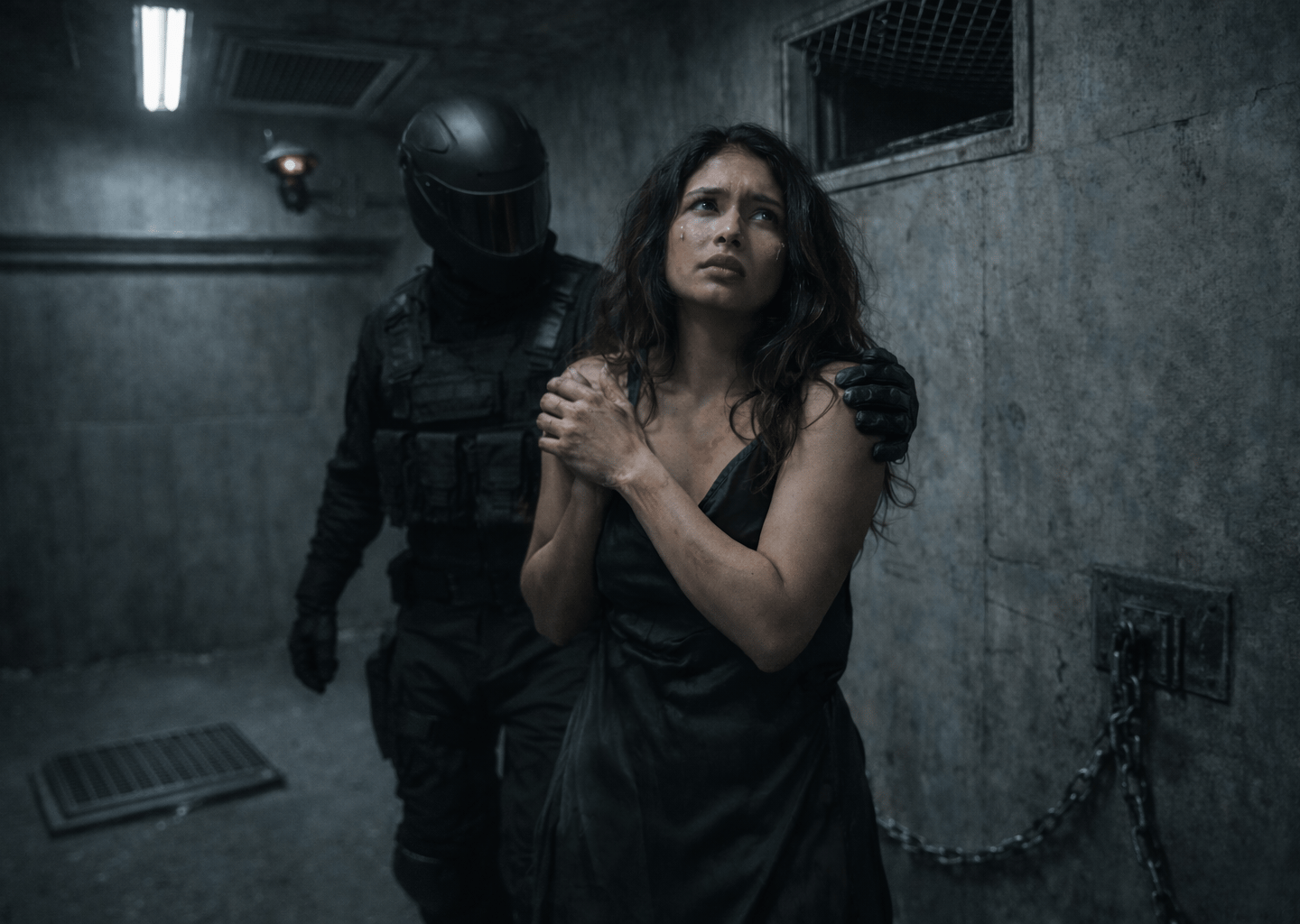 Setting: Sub-Level 4, the specialized containment area. A stark contrast to the opulence above—cold concrete walls, harsh fluorescent lighting, the hum of ventilation systems. Priya is in a reinforced cell, her wrists shackled to the wall with high-tech restraints. She's still in her emerald silk dress, now torn and stained, her hair disheveled, face bruised from the capture.