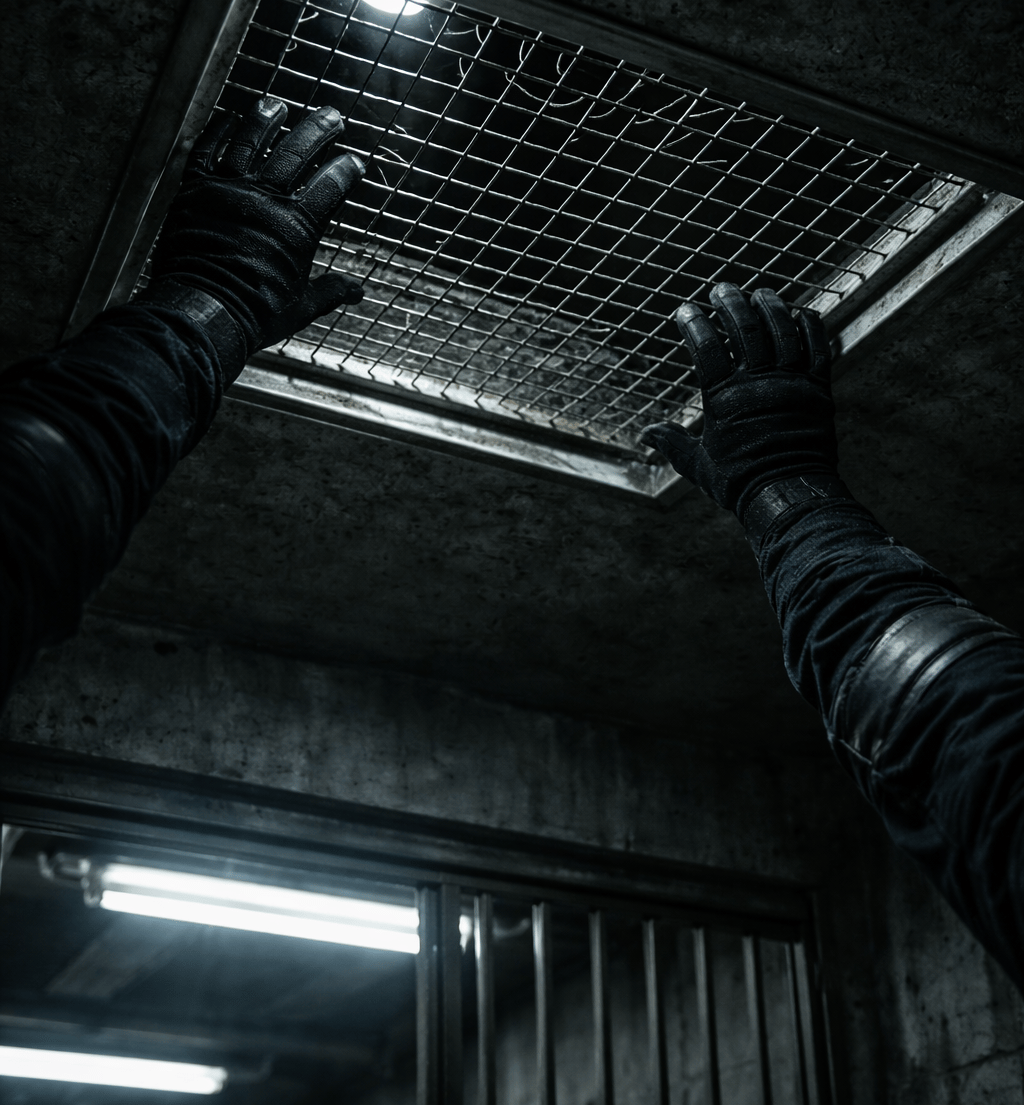 A soft hiss as a ventilation grate is carefully removed from inside the duct system. A figure drops down silently—dressed in black tactical gear, face obscured by a mask, movements precise and practiced.