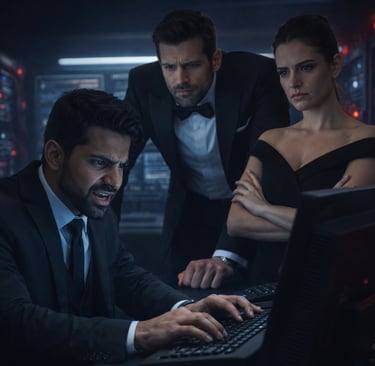 Setting: The high-tech command center, Vikram stands before a wall of monitors, his hands trembling as he pulls up security footage and code analysis. The Chairman enters, hastily dressed, Zara right behind him in tactical gear.