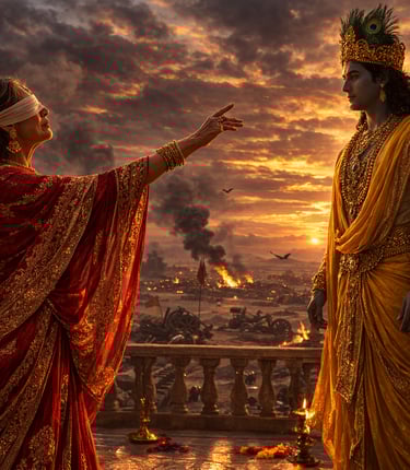 Discover the complete Gandhari Mahabharata visual story — the blindfolded queen who chose darkness for love, warned a son who wouldn't listen, cursed Krishna in grief, and found peace only in the forest. Life lessons from the Mahabharata's most misunderstood woman.
